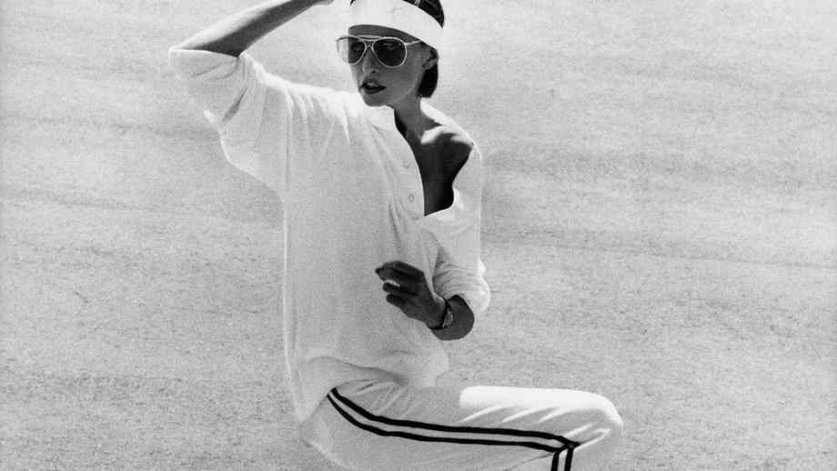 Model running wearing gym gear and sunglasses