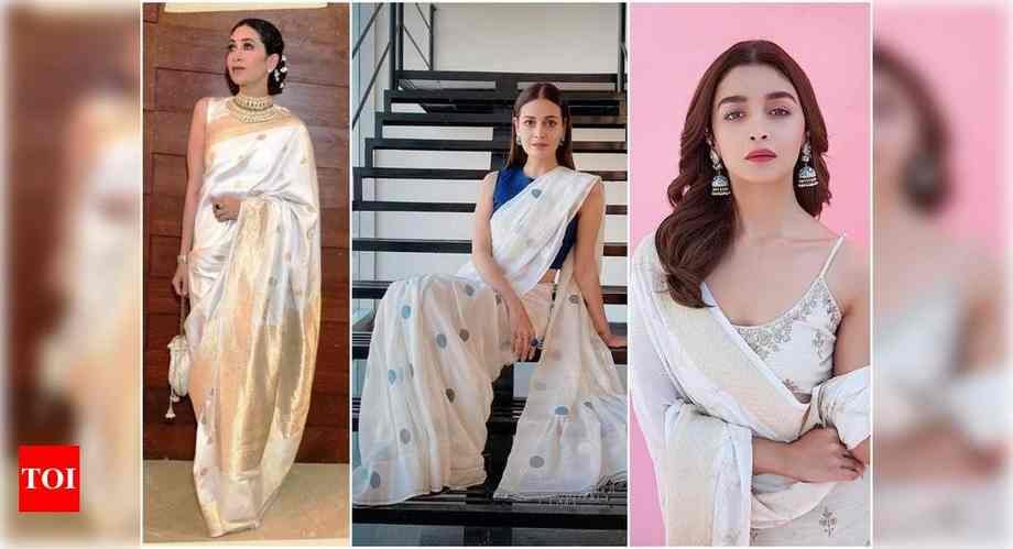 Dia Mirza is class personified on this pristine white sari worn a blue sleeves shirt and matching earrings and assertion ring