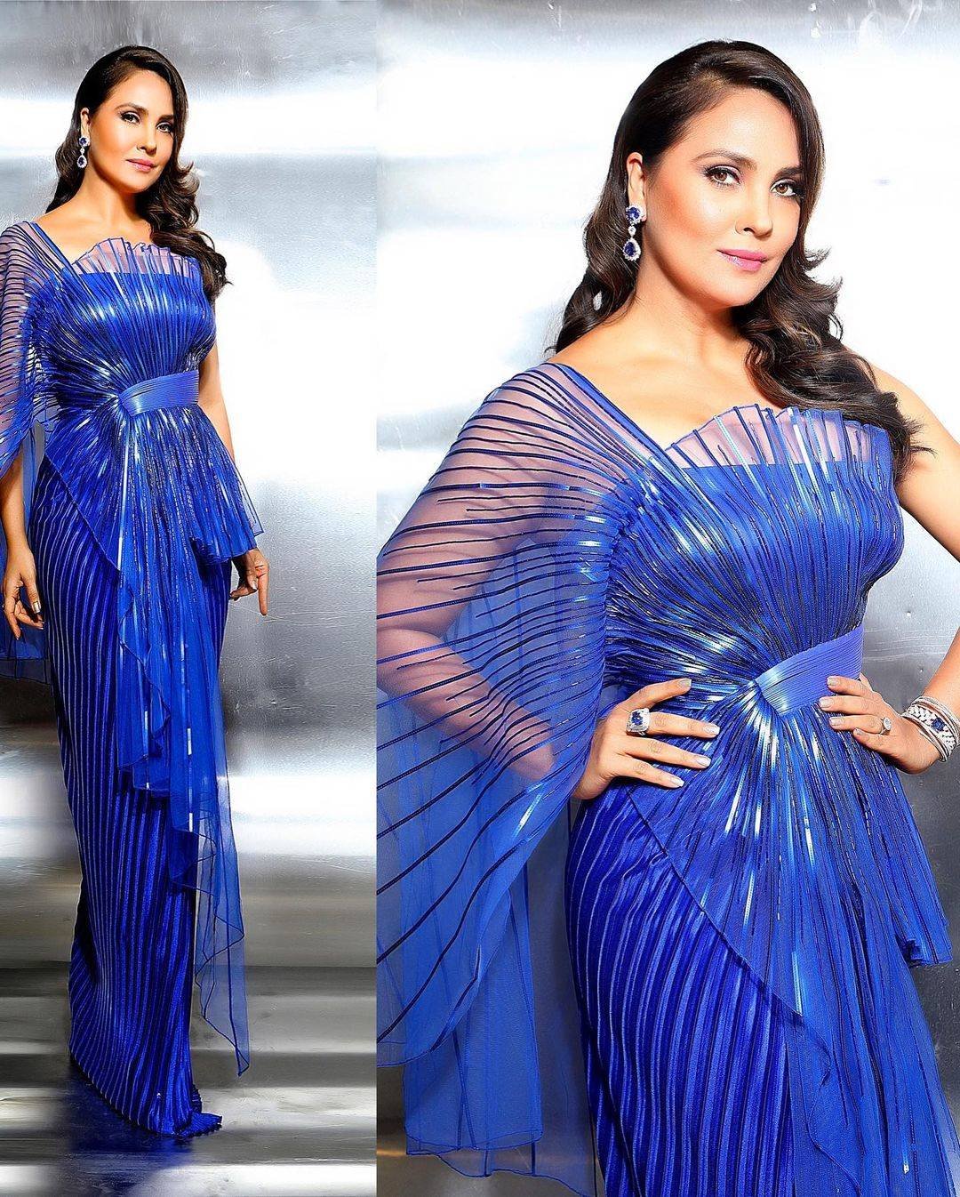 Lara likes to experiment on the subject of robes. She appears attractive on this Amit Aggarwal which she styled to perfection along with her comfortable, wavy tresses.