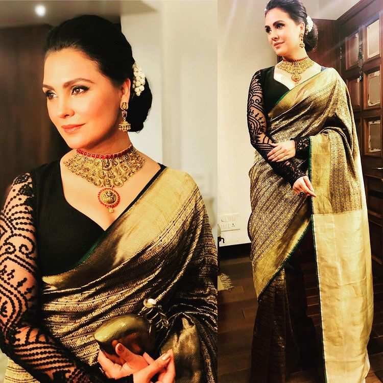 She pulls off saris as nobody else does. The actor exudes class on this black and gold sari with full-sleeved shirt which she wore for Ranveer Singh and Deepika Padukone’s reception.